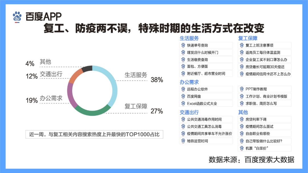 虽然全国疫情整体得到了有效控制,但是依然不能松懈。“复工上班注意事项” 、“企业复工买不到口罩怎么办”、“自己带饭做什么比较好”、“疫情期间怎么面试 ”。依然是众多网友重点关注的话题,安全地解决复工之下的生活服务问题、如何做好复工防护等仍然需要摆在首位。