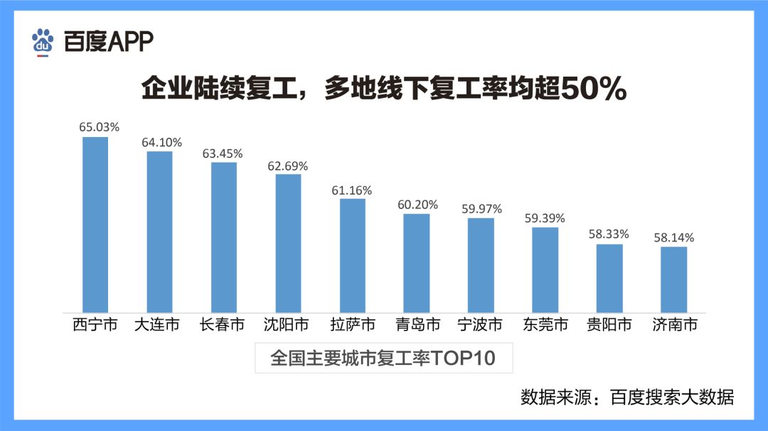 人们对复工复产的感知更多来自日常生活,众多超市、饭店近来陆续开门营业。百度搜索大数据显示,餐饮行业复工进展顺利,北京已有超九成餐厅开业,上海、广州、宁波、深圳等城市营业率均超过80%,成都、上海、北京、广州、沈阳等城市商超营业率也均超过80%。