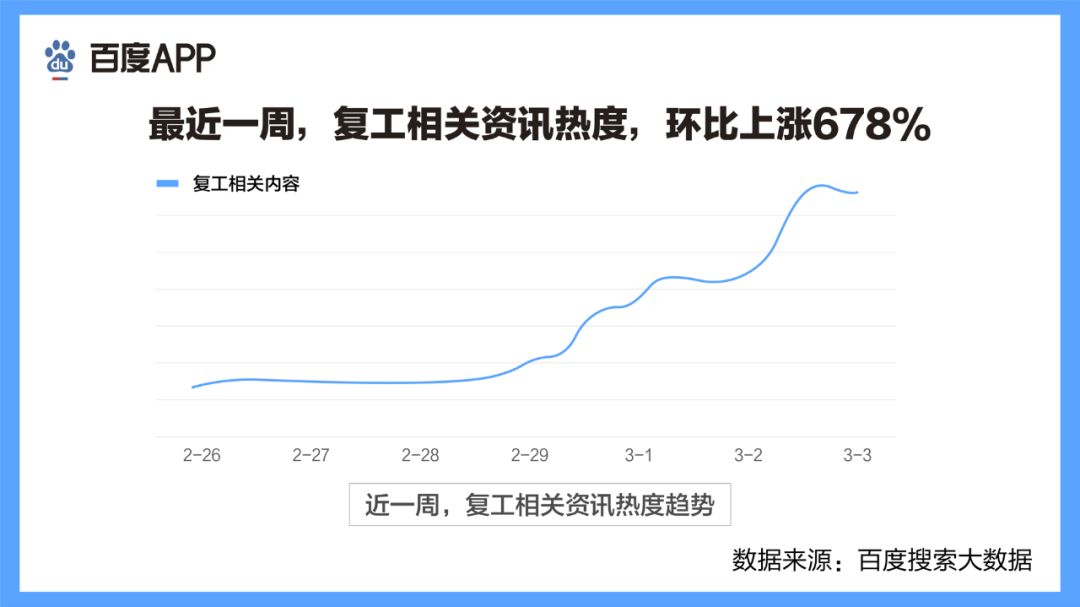 百度搜索大数据显示,最近一周与复工相关的资讯热度环比上涨678%,这是用户主动索取信息所呈现的结果,复工已经成为当下网民关注的绝对热点。从各行业复工数据来看,当前全国整体复工指数呈逐渐增长的态势,多个行业复工程度陆续接近节前水平。金融、汽车服务、餐饮等五个热门行业,复工率都超过了七成。