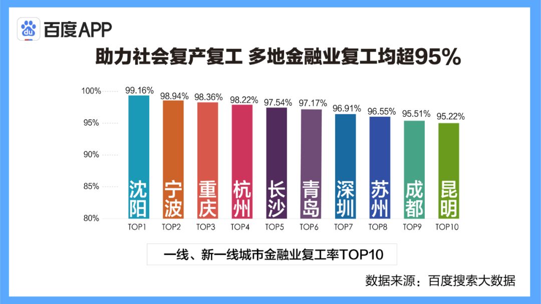 从具体行业来看,多地金融业复工率超95%,保证了经济生活得以正常开展。沈阳、宁波、重庆、杭州等城市排名靠前。为了减少接触,复产复工时,私家车出行增多。百度搜索大数据显示,全国主要城市汽车服务业复工率均超过95%,沈阳市再次位居榜首。