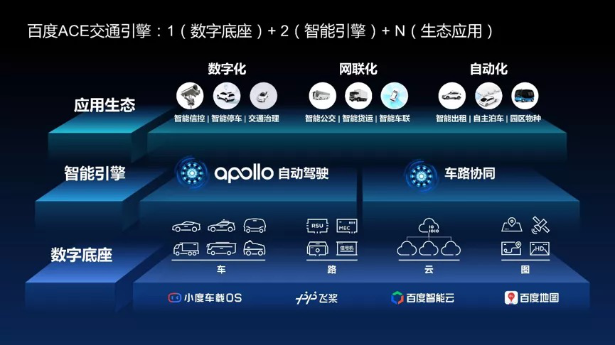一大数字底座,指“车”、“路”、“云”、“图”等数字交通基础设施,包括小度车载OS、飞桨、百度智能云、百度地图,可以给车联网、智能信控、大数据决策等提供基础科技能力;