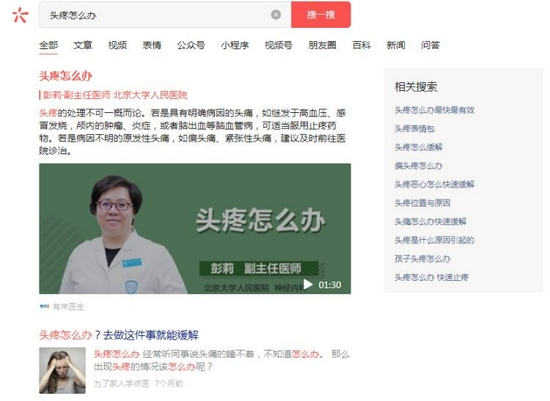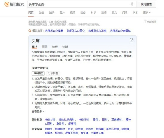 搜狗搜索会将头痛的病因、如何自诊、涉及科室等信息以卡片形式呈现。