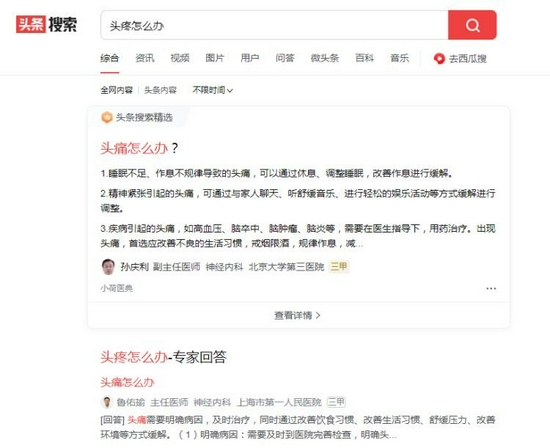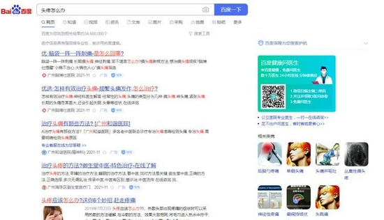 在百度搜索“头疼怎么办”,前五条都是广告,有的是引导你去一些小诊所看诊的,有的在卖保健品。